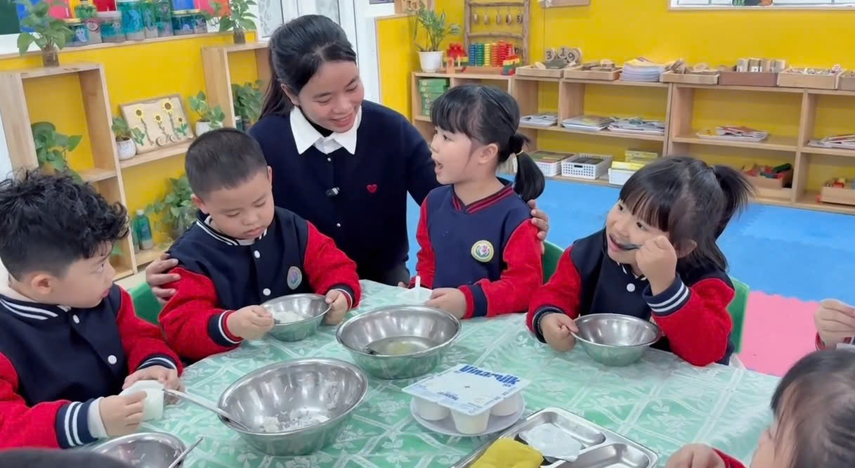 Không chỉ dừng lại ở việc nấu ngon, các cô giáo trên lớp còn là người bạn đồng hành trong mỗi giờ ăn. Bằng sự kiên nhẫn và ân cần, các cô giúp trẻ: