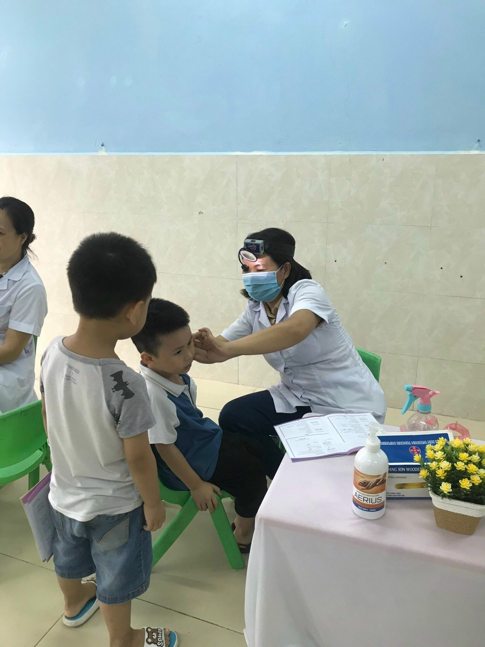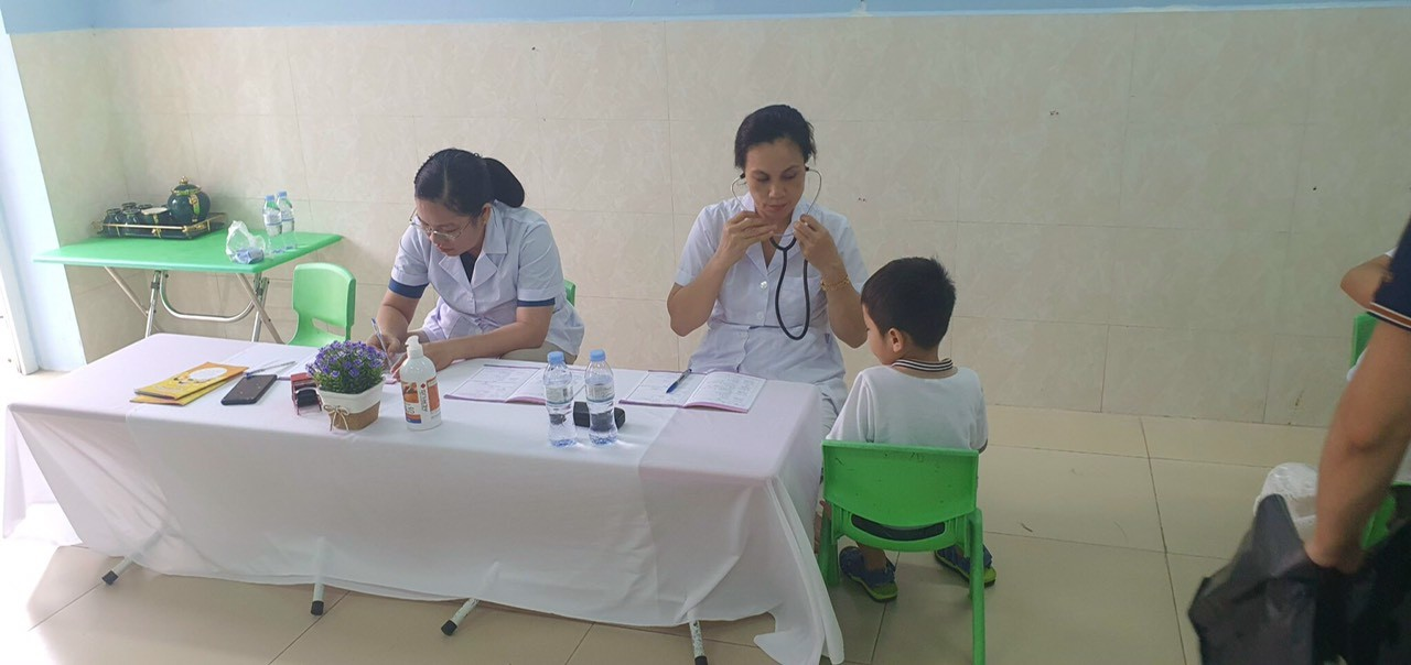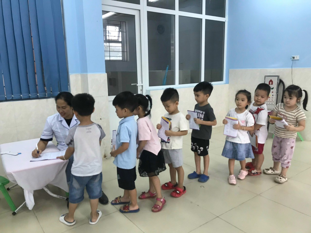 Các bé rất hợp tác, xếp hàng đợi đến lượt khám, nghe và thực hiện theo yêu cầu của bác sĩ. Có vài bé nghỉ học do bị ốm vẫn được bà và mẹ đưa đến khám sức khỏe tại trường. Tình trạng của mỗi bé cũng được các bác sĩ ghi lại trong sổ theo dõi sức khỏe.