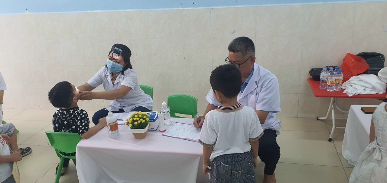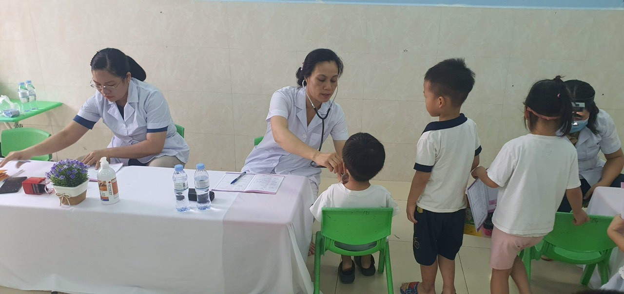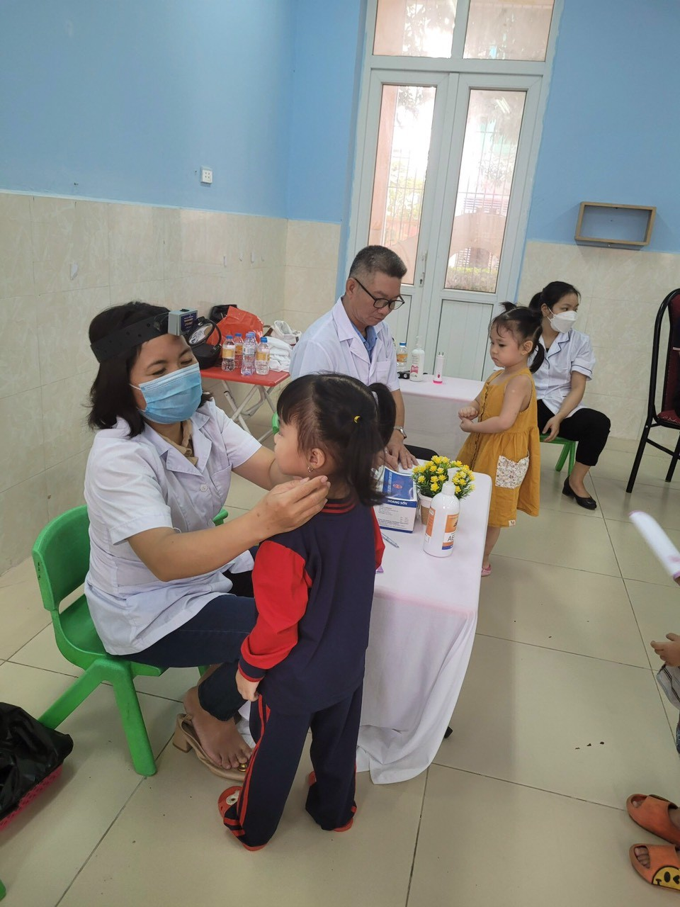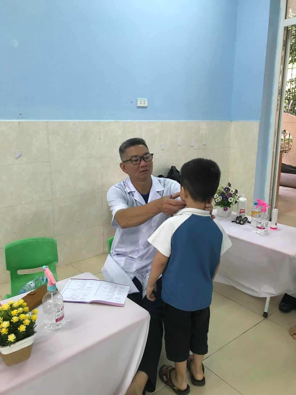 Các bé rất hợp tác, xếp hàng đợi đến lượt khám, nghe và thực hiện theo yêu cầu của bác sĩ. Có vài bé nghỉ học do bị ốm vẫn được bà và mẹ đưa đến khám sức khỏe tại trường. Tình trạng của mỗi bé cũng được các bác sĩ ghi lại trong sổ theo dõi sức khỏe.