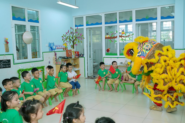 Chào đón các bé là các cô giáo cùng những nhân vật hoạt hình ngộ nghĩnh. Các bé được hòa mình trong tiếng trống rộn ràng cùng những điệu múa lân sôi động.