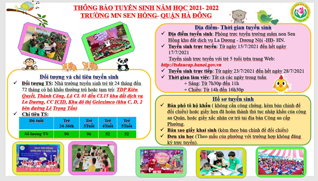 Trường mầm non Sen Hồng xin thông báo tới toàn thể các bậc phụ huynh học sinh kế hoạch tuyển sinh của nhà trường năm học 2021-2022 như sau: